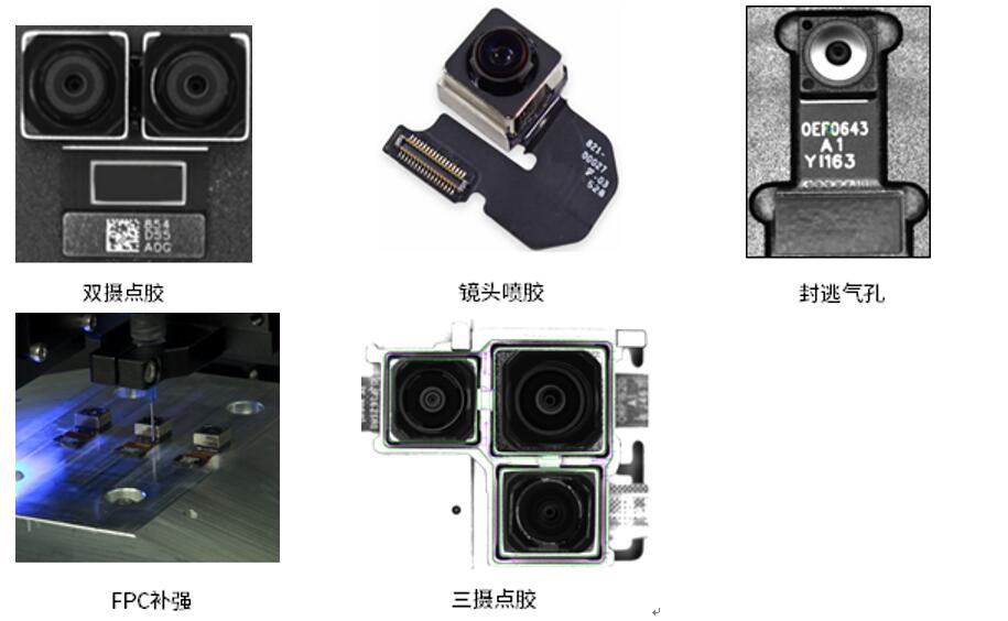 攝像頭制程中點膠工藝是不可或缺的。攝像頭模組生產(chǎn)中的點膠工藝無處不在:各組件之間的粘接,鏡頭的固定,軟板補強,馬達(dá)pin腳焊點的保護,雙攝三攝支架的固定,模組的防塵防水均由點膠完成。